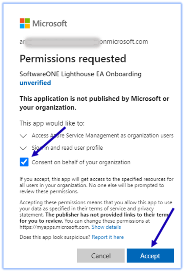 3 | Under This app would like to:, review the permission requested. Click on Consent on behalf of your organization. Then click on Accept. ![]() |