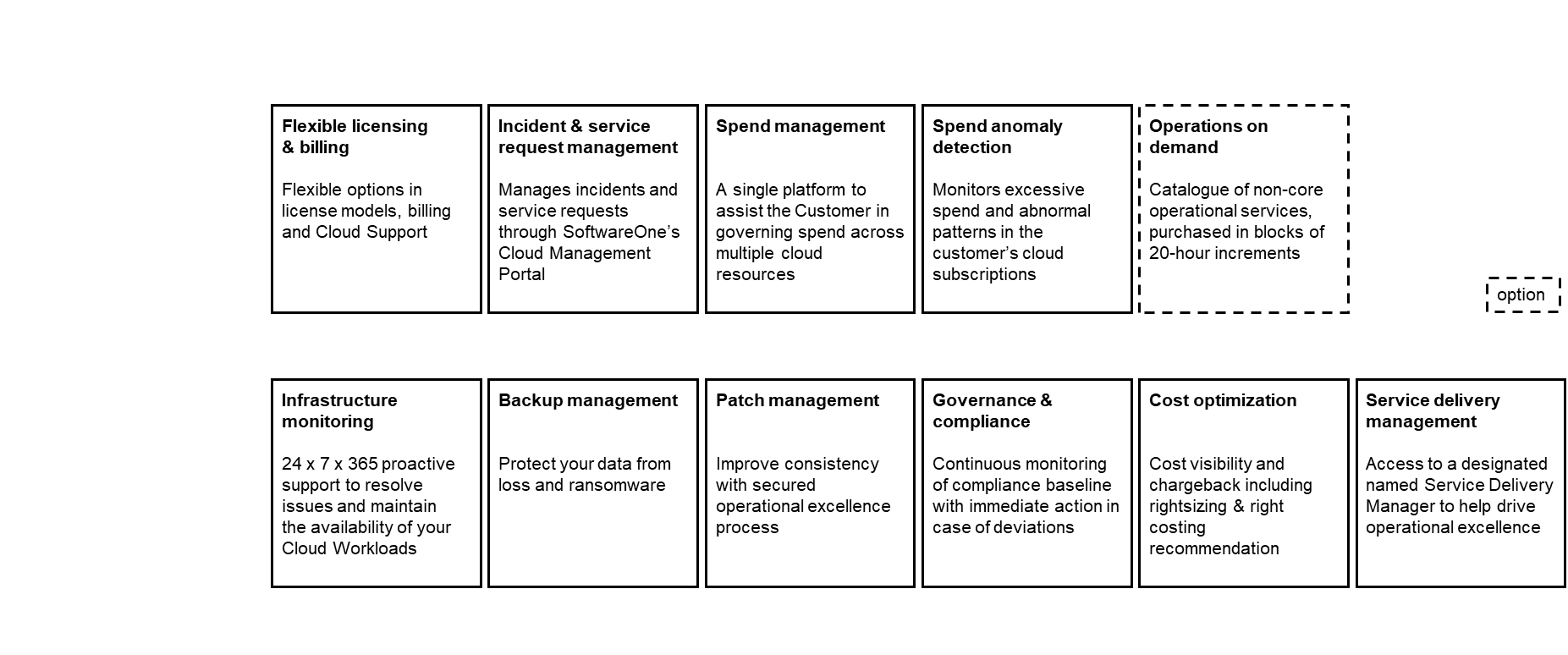 The SoftwareOne Cloud Managed Services (CMS) - Advanced service has been designed to give our customers peace of mind by working with them to manage their daily cloud operations. SoftwareOne is taking care of critical tasks such as incident management, monitoring, governance & compliance, backup, patch and cost management, allowing our customers to focus on their workloads and applications.
